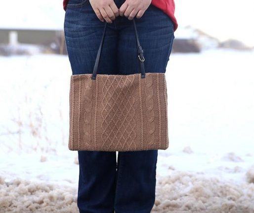 Если у вас есть ненужный свитер с гладким или рельефным узором или крупной вязки трикотажное полотно, из него можно сшить такую уютную, оригинальную, симпатичную и удобную сумку. А чтобы сумка не вытягивалась и хорошо держала форму, полотно надо укрепить плотным флизелином или дублерином. Дополнительную прочность придаст подкладка — в этом случае она сшита из льна. Для ручек подойдёт обычный ремешок.