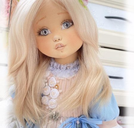 Коллекционная текстильная кукла Аннушка. Малышка сшита из хлопка, обтянута трикотажем. Личико объёмное. Девчушка вся подвижная. Головушка крутится и наклоняется. Ручки и ножки крепятся, как у будуарных кукол или куклы-болтушки. Нюточка стоять не хочет, зато она умеет красиво сидеть и мило складывать ручки. Пальчики на ручках гнутся, есть маникюр. Волосы — натуральная козочка, очень мягкие, можно аккуратно расчесывать, закручивать, менять прическу. В волосах заколочка, цветочек анютины глазки. Цветочек ручная работа, стекло-лэмпворк. Вся одежда съёмная, кроме комбинезона. Одежка сшита из хлопка, батиста, шифона, украшена кружевом, бисером. Ботиночки сшиты из натуральной кожи. У этой модницы есть сумочка, а там лежат расческа и ножницы. Рост куколки около 56 см.