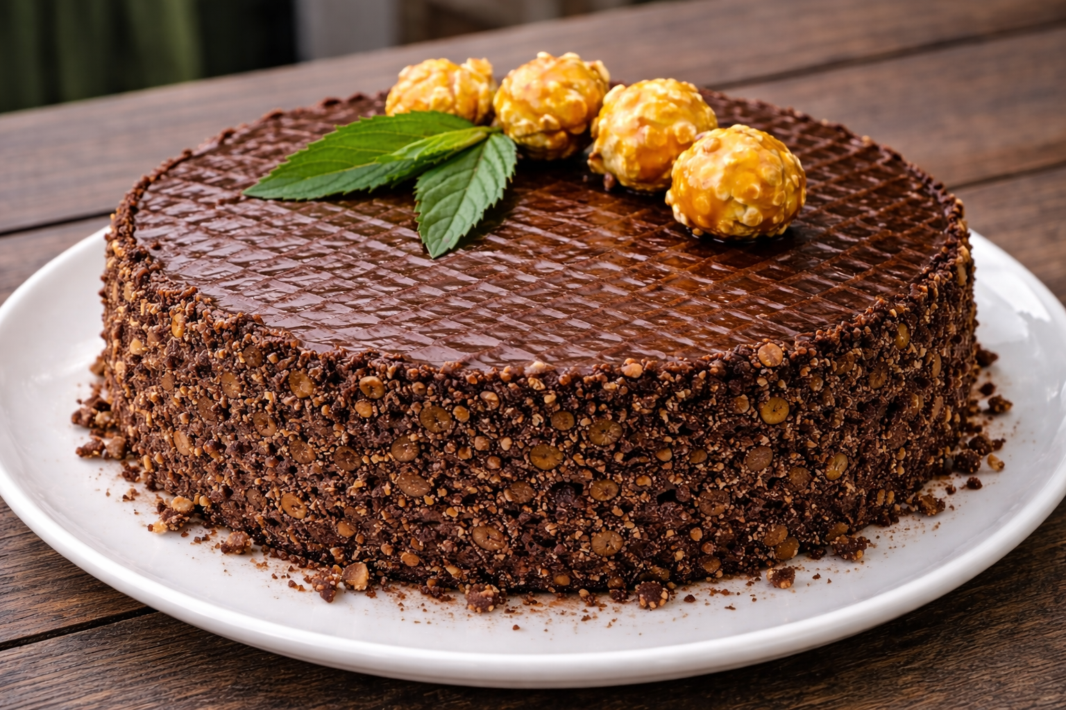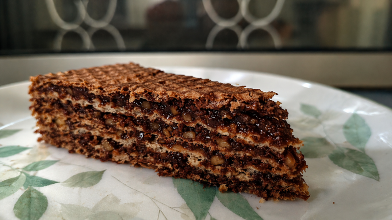 Торт Макадэ — это простой домашний десерт без выпечки из вафель с насыщенной орехово-медовой начинкой. Благодаря сливочному маслу и какао он получается плотным, ароматным и хорошо держит форму.
