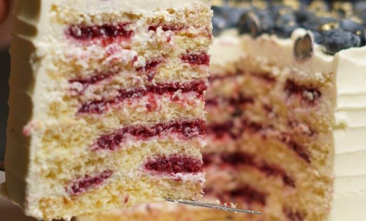 Корж — крем — малиновый конфитюр — корж — крем — малиновый конфитюр – корж — крем и отправляем на ночь в холодильник.