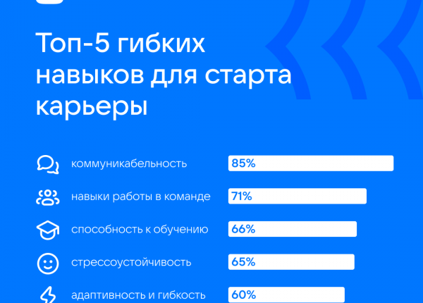 В топ-5 гибких навыков, которые молодежь считает наиболее важными для старта карьеры, входят: коммуникабельность (85%), навыки работы в команде (71%), способность к обучению (66%), стрессоустойчивость (65%), адаптивность и гибкость (60%).