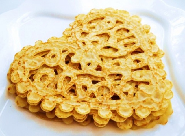 Разогрейте сковороду на среднем огне, смажьте растительным маслом. Следите за тем, чтобы масло покрыло всю поверхность сковороды для того, если тесто прилипнет к сковородке, ажур может быть испорчен.