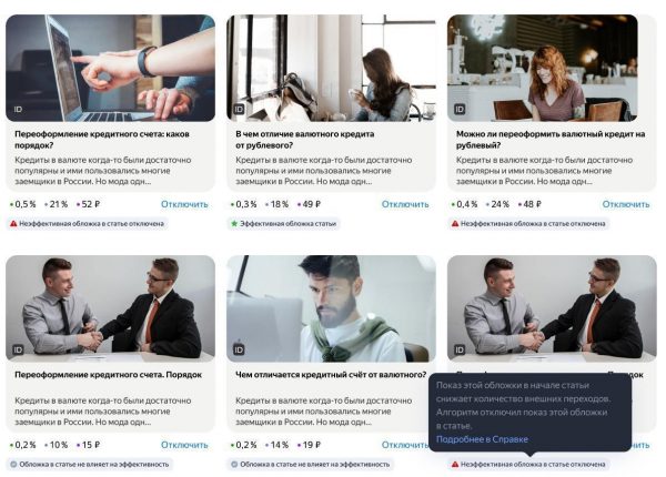 Когда пользователь включает эту функцию, алгоритм анализирует, как обложка («шапка») в статье влияет на количество внешних переходов. Если анализ покажет, что обложки оказывают негативное влияние, сервис автоматически отключит их показ.