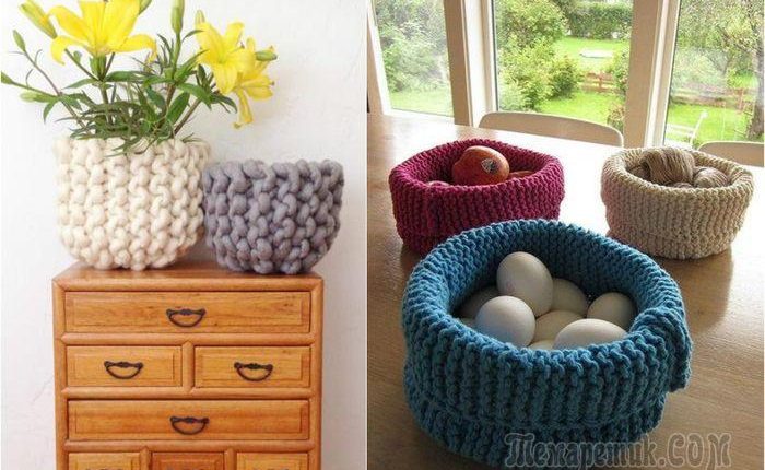 Безусловно, корзина является практичным предметом, в котором удобно хранить различные вещи и мелочи. Но такие вязаные аксессуары способны не только навести порядок в доме, но и сделать интерьер более интересным и разнообразным, выступить в качестве цветовых пятен и наполнить пространство уютом.