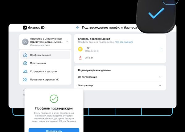 В личном кабинете VK Бизнес ID можно подтвердить реквизиты через банк и получить дополнительные возможности, доступные только верифицированным пользователям.