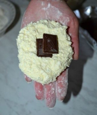 6. Посыпать руки мукой. Небольшую часть массы столовой ложкой выложить себе на руку, сверху — кусочек шоколада и сформировать сырник.
