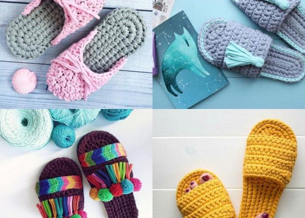 Такая уютная обувь получается очень удобной, мягкой и вяжется всего за один вечер! Вязание крючком трикотажных тапочек особо не отличается от вязания из привычной пряжи. Разница лишь в том, что толщина трикотажной пряжи достигает 7-9 мм, поэтому для работы тебе понадобится крючок 7-10 мм. А также несколько однотонных трикотажных футболок.