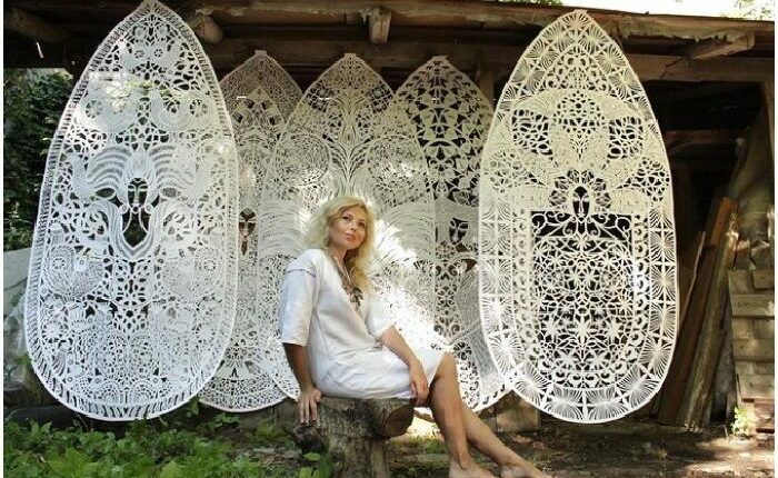 Она создаёт большие по размеру вытынанки-занавески, для современных интерьеров жилых и общественных заведений. Взяв в руки бумагу и острый нож, она не только возродила древний вид искусства, но и заслужила мировое признание. В нашей публикации удивительная подборка ее масштабных ажурных панно из бумаги, которые уже покорили Польшу, Францию и даже Южную Корею.