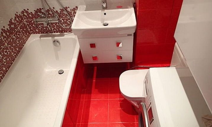 В этой ванной комнате есть все необходимое: сама ванна, туалет, раковина, стиральная машинка и даже небольшой стеллаж. При этом расставлена мебель очень компактно, тем самым места вполне хватит для одного человека.