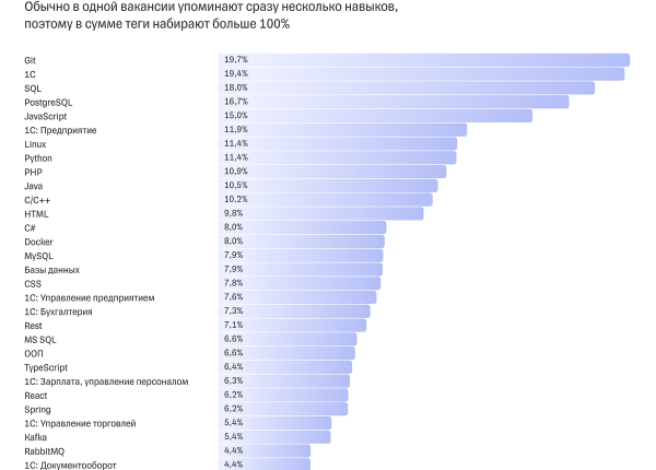 - Самые востребованные для новичков навыки – 1С, SQL и Git. Чаще обычного также упоминают HTML и CSS. Среди умений для программистов с опытом от 6 лет и больше самые частые – владение PostgreSQL, Java, Python, C. Нередко встречаются брокеры сообщений Kafka и RabbitMQ – новичков для работы с этими технологиями почти не ищут.