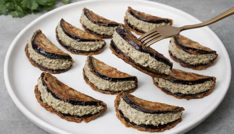 Когда баклажаны остынут, на каждый кружочек выложите примерно 1 чайную ложку ореховой начинки. Сложите кружочек пополам или слегка сверните. Получится форма, похожая на небольшую «ракушку».