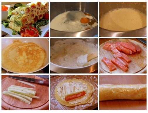 1. Приготовить тесто. Для этого взбить яйца с молоком и щепоткой соли. Испечь тоненькие омлетики. Должно получиться 8 омлетов (сковорода диаметром 16 см.)