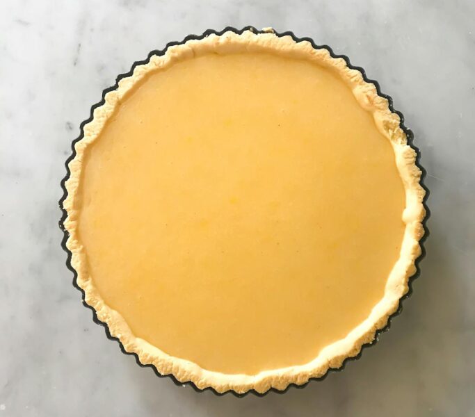 Аккуратно перенесите тесто в форму для тарта (диаметром 23 см). Прижмите его к дну и стенкам формы, разглаживая ладонями. При необходимости обрежьте излишки.