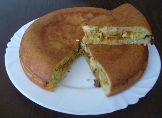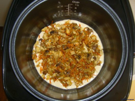 Взбиваем яйца, добавляем соль и молоко, добавляем муку. Тесто должно быть как на оладьи, консистенции не жирной сметаны. В разогретую чашу выложить одну часть теста, затем выложить ровным слоем начинку: разогретая чаша, выливаем половину теста и кладем начинку. Заливаем начинку оставшимся тестом.