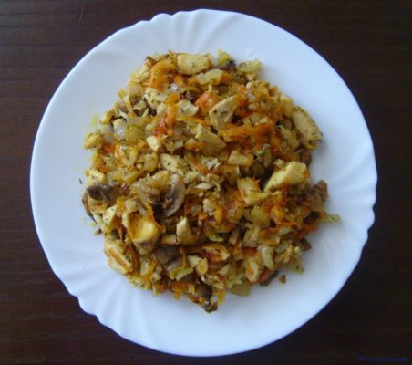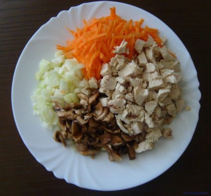 Шампиньоны, морковь, куриное филе и лук мелко измельчить и обжарить на сковороде с растительным маслом. Добавить черный перец и соль. Для приготовления теста для пирога взбить миксером молоко, яйца, сметану, соль и муку.