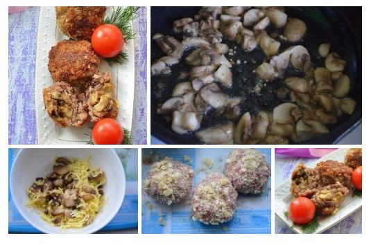 3. Чипсы перемолоть в крошку и соединить с панировочными сухарями. В ладошку взять немного фарша, посередине выложить 1 ч.л. сырно-грибной смеси. Защипнуть края, формируя котлетку. Окунуть в яично-мучную смесь, затем в панировку.