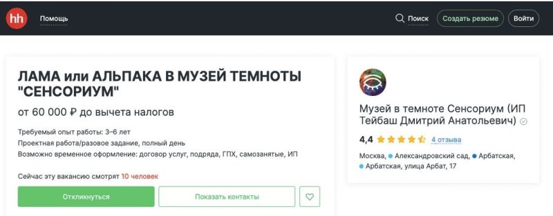 Интерактивный музей Сенсориум на Арбате 17, где в полной темноте проводят экскурсии незрячие гиды, открыл вакансию ламы/альпака на сайте по поиску работы.