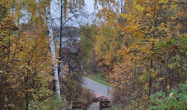 Продолжаю свой рассказ о прогулке по осеннему Плёсу. Остановились мы на Воскресенской горе, куда ведет довольно крутой подъем по деревянной лестнице.